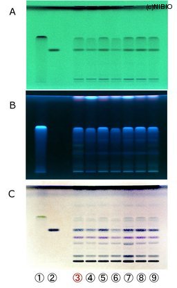 | Memo | A. 254nm B. 366nm C. 4-ジメチルアミノベンズアルデヒド試液(加熱) 4-dimethylamino-benzaldehyde test solution ①STD.Acteoside ②STD.Geniposidic acid ③NIB-025 ④NIB-047 ⑤NIB-099 ⑥NIB-131 ⑦NIB-158 ⑧NIB-198 ⑨NIB-213 |
