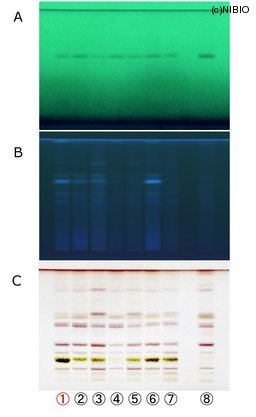 | Memo | A. 254nm B. 366nm C. 希硫酸試液(加熱) dilute sulfuric acid ①NIB-016 ②NIB-079 ③NIB-096 ④NIB-120 ⑤NIB-152 ⑥NIB-189 ⑦NIB-212 ⑧Achyranthes Root |