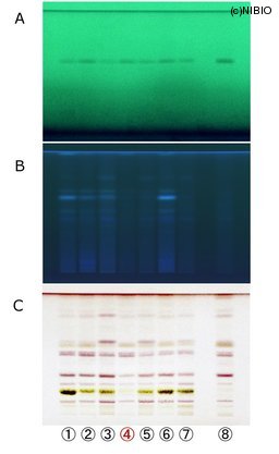 | Memo | A. 254nm B. 366nm C. 希硫酸試液(加熱) ①NIB-016 ②NIB-079 ③NIB-096 ④NIB-120 ⑤NIB-152 ⑥NIB-189 ⑦NIB-212 ⑧Achyranthes Root |