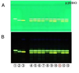 | Memo | A. 254nm B. 366nm ①STD.Berberine ②STD.Palmatine ③STD.Coptisine ④NIB-013 ⑤NIB-041 ⑥NIB-042 ⑦NIB-094 ⑧NIB-115 ⑨NIB-116 ⑩NIB-150 ⑪NIB-185 ⑫NIB-186 ⑬NIB-215 |