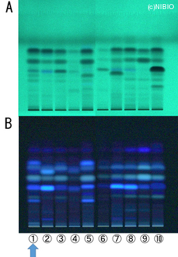 | Condition | (試料調製)各試料の粉末0.1 gにヘキサン1.0 mLを加え、約5分間超音波処理を行った。遠心分離後、得られた上清を試料溶液とした。 (TLC条件)注入量:10 μL、展開溶媒:メタノール/水(9:1)、検出:UV照射(254 nm、366 nm)。HPTLCガラスプレートは、薄層クロマトグラフィー用オクタデシルシリル化シリカゲル(蛍光剤入り)を使用。 |