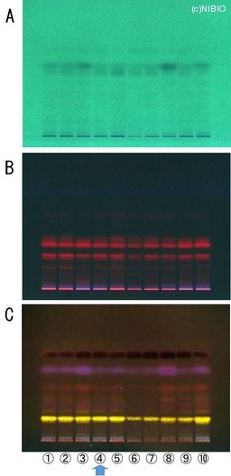 | Memo | A. 254nm B. 366nm C. 4-メトキシベンズアルデヒド・硫酸試液噴霧後366 nm ① NIB-0853 ② NIB-0854 ③ NIB-0855 ④ NIB-0856 ⑤ NIB-0857 ⑥ NIB-0858 ⑦ NIB-0859 ⑧ NIB-0860 ⑨ NIB-0861 ⑩ NIB-1114 |