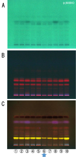 | Memo | A. 254nm B. 366nm C. 4-メトキシベンズアルデヒド・硫酸試液噴霧後366 nm ① NIB-0853 ② NIB-0854 ③ NIB-0855 ④ NIB-0856 ⑤ NIB-0857 ⑥ NIB-0858 ⑦ NIB-0859 ⑧ NIB-0860 ⑨ NIB-0861 ⑩ NIB-1114 |