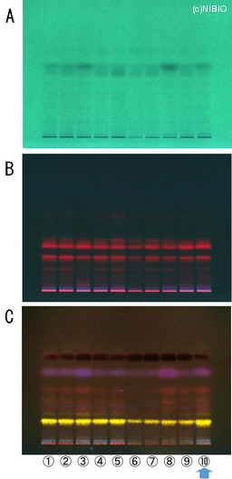 | Memo | A. 254nm B. 366nm C. 4-メトキシベンズアルデヒド・硫酸試液噴霧後366 nm ① NIB-0853 ② NIB-0854 ③ NIB-0855 ④ NIB-0856 ⑤ NIB-0857 ⑥ NIB-0858 ⑦ NIB-0859 ⑧ NIB-0860 ⑨ NIB-0861 ⑩ NIB-1114 |