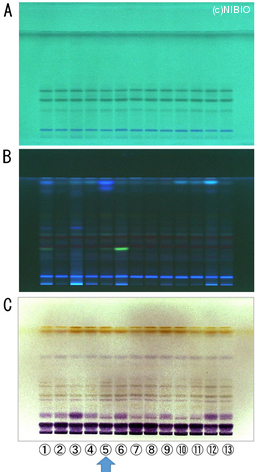 | Memo | A. 254nm B. 366nm C. 1-ナフトール・硫酸試液(加熱) ① NIB-0873 ② NIB-0874 ③ NIB-0875 ④ NIB-0876 ⑤ NIB-0877 ⑥ NIB-0878 ⑦ NIB-0879 ⑧ NIB-0880 ⑨ NIB-0881 ⑩ NIB-0882 ⑪ NIB-0883 ⑫ NIB-0884 ⑬ NIB-1128 |
