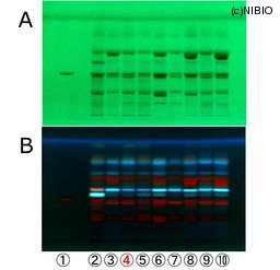 | Memo | A. 254nm B. 366nm ①STD.Sennoside A ②NIB-028 ③NIB-049 ④NIB-101 ⑤NIB-134 ⑥NIB-135 ⑦NIB-161 ⑧NIB-201 ⑨NIB-202-3 ⑩NIB-223 |