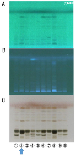 | Memo | A. 254nm B. 366nm C. 希硫酸試液噴霧後、加熱 ① NIB-0962 ② NIB-0963 ③ NIB-0964 ④ NIB-0965 ⑤ NIB-0975 ⑥ NIB-0977 ⑦ NIB-0978 ⑧ NIB-0980 ⑨ NIB-0981 ⑩ NIB-1127 |