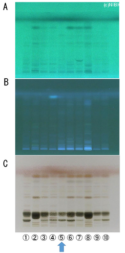 | Memo | A. 254nm B. 366nm C. 希硫酸試液噴霧後、加熱 ① NIB-0962 ② NIB-0963 ③ NIB-0964 ④ NIB-0965 ⑤ NIB-0975 ⑥ NIB-0977 ⑦ NIB-0978 ⑧ NIB-0980 ⑨ NIB-0981 ⑩ NIB-1127 |