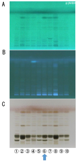 | Memo | A. 254nm B. 366nm C. 希硫酸試液噴霧後、加熱 ① NIB-0962 ② NIB-0963 ③ NIB-0964 ④ NIB-0965 ⑤ NIB-0975 ⑥ NIB-0977 ⑦ NIB-0978 ⑧ NIB-0980 ⑨ NIB-0981 ⑩ NIB-1127 |