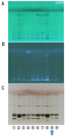 | Memo | A. 254nm B. 366nm C. 希硫酸試液噴霧後、加熱 ① NIB-0962 ② NIB-0963 ③ NIB-0964 ④ NIB-0965 ⑤ NIB-0975 ⑥ NIB-0977 ⑦ NIB-0978 ⑧ NIB-0980 ⑨ NIB-0981 ⑩ NIB-1127 |