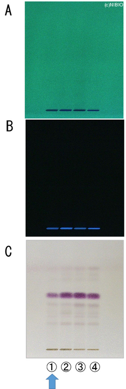 | Memo | A. 254nm B. 366nm C. バニリン・硫酸試液噴霧後、加熱 ①NIB-0998 ②NIB-0999 ③NIB-1000 ④NIB-1001 |