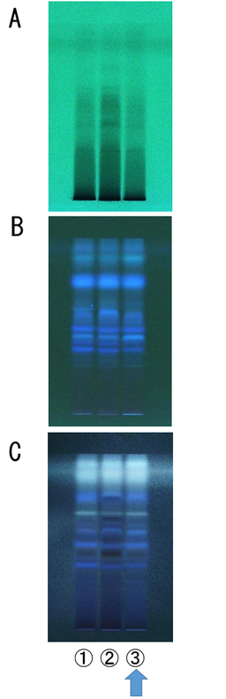 | Condition | (試料調製)各試料の粉末0.2 gに酢酸エチル1.0 mLを加え、約5分間超音波処理を行った。遠心分離後、残留物にアセトン1.0 mLを加え、約5分間超音波処理を行った。遠心分離後、得られた上清を試料溶液とした。 (TLC条件)注入量:試料溶液5 μL、展開溶媒:酢酸エチル/メタノール/水(7:2:1)、検出:UV照射(254 nm、366 nm)、希硫酸試液噴霧し、加熱後、UV照射(366 nm)。 |