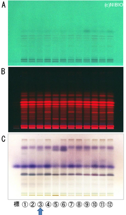 | Memo | A. 254nm B. 366nm C. 4-メトキシベンズアルデヒド・硫酸・酢酸・エタノール試液噴霧後、加熱 標:l-メントール ①NIB-1002 ②NIB-1003 ③NIB-1004 ④NIB-1005 ⑤NIB-1006 ⑥NIB-1008 ⑦NIB-1011 ⑧NIB-1012 ⑨NIB-1013 ⑩NIB-1014 ⑪NIB-1015 ⑫NIB-1123 |
