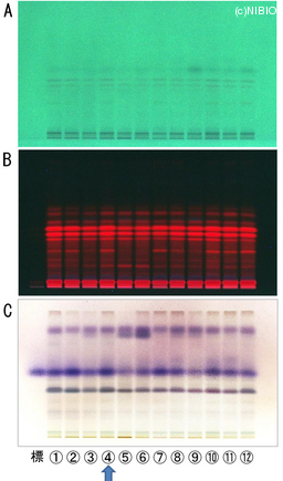 | Memo | A. 254nm B. 366nm C. 4-メトキシベンズアルデヒド・硫酸・酢酸・エタノール試液噴霧後、加熱 標:l-メントール ①NIB-1002 ②NIB-1003 ③NIB-1004 ④NIB-1005 ⑤NIB-1006 ⑥NIB-1008 ⑦NIB-1011 ⑧NIB-1012 ⑨NIB-1013 ⑩NIB-1014 ⑪NIB-1015 ⑫NIB-1123 |