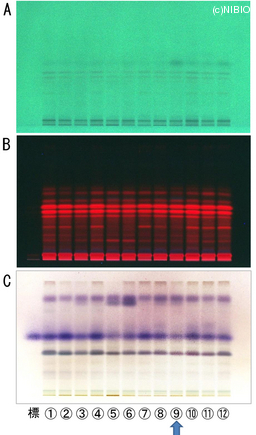 | Memo | A. 254nm B. 366nm C. 4-メトキシベンズアルデヒド・硫酸・酢酸・エタノール試液噴霧後、加熱 標:l-メントール ①NIB-1002 ②NIB-1003 ③NIB-1004 ④NIB-1005 ⑤NIB-1006 ⑥NIB-1008 ⑦NIB-1011 ⑧NIB-1012 ⑨NIB-1013 ⑩NIB-1014 ⑪NIB-1015 ⑫NIB-1123 |