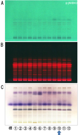 | Memo | A. 254nm B. 366nm C. 4-メトキシベンズアルデヒド・硫酸・酢酸・エタノール試液噴霧後、加熱 標:l-メントール ①NIB-1002 ②NIB-1003 ③NIB-1004 ④NIB-1005 ⑤NIB-1006 ⑥NIB-1008 ⑦NIB-1011 ⑧NIB-1012 ⑨NIB-1013 ⑩NIB-1014 ⑪NIB-1015 ⑫NIB-1123 |