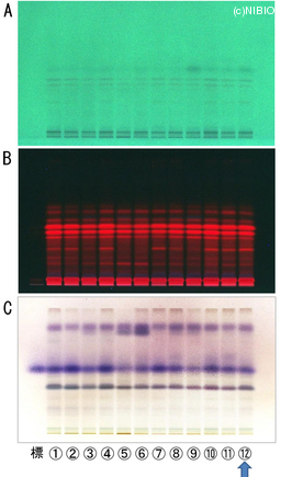 | Memo | A. 254nm B. 366nm C. 4-メトキシベンズアルデヒド・硫酸・酢酸・エタノール試液噴霧後、加熱 標:l-メントール ①NIB-1002 ②NIB-1003 ③NIB-1004 ④NIB-1005 ⑤NIB-1006 ⑥NIB-1008 ⑦NIB-1011 ⑧NIB-1012 ⑨NIB-1013 ⑩NIB-1014 ⑪NIB-1015 ⑫NIB-1123 |