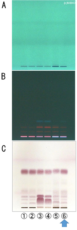 | Memo | A. 254nm B. 366nm C. バニリン・硫酸試液噴霧後、加熱 ①NIB-1053 ②NIB-1054 ③NIB-1055 ④NIB-1056 ⑤NIB-1057 ⑥NIB-1059 |
