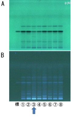 | Memo | A. 254nm B. 366nm 標:ゲンチオピクロシド ①NIB-1085 ②NIB-1086 ③NIB-1087 ④NIB-1088 ⑤NIB-1089 ⑥NIB-1090 ⑦NIB-1091 ⑧NIB-1125 |