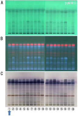 | Memo | A. 254nm B. 366nm C. 4-メトキシベンズアルデヒド・硫酸試液噴霧後、加熱 ①NIB-1097 ②NIB-1098 ③NIB-1099 ④NIB-1100 ⑤NIB-1101 ⑥NIB-1102 ⑦NIB-1103 ⑧NIB-1104 ⑨NIB-1105 ⑩NIB-1106 ⑪NIB-1107 ⑫NIB-1108 ⑬NIB-1109 ⑭NIB-1110 ⑮NIB-1111 ⑯NIB-1112 ⑰NIB-1113 ⑱NIB-1117 |