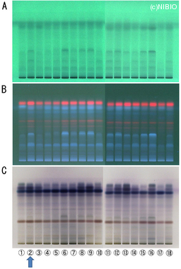 | Memo | A. 254nm B. 366nm C. 4-メトキシベンズアルデヒド・硫酸試液噴霧後、加熱 ①NIB-1097 ②NIB-1098 ③NIB-1099 ④NIB-1100 ⑤NIB-1101 ⑥NIB-1102 ⑦NIB-1103 ⑧NIB-1104 ⑨NIB-1105 ⑩NIB-1106 ⑪NIB-1107 ⑫NIB-1108 ⑬NIB-1109 ⑭NIB-1110 ⑮NIB-1111 ⑯NIB-1112 ⑰NIB-1113 ⑱NIB-1117 |
