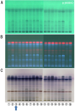 | Memo | A. 254nm B. 366nm C. 4-メトキシベンズアルデヒド・硫酸試液噴霧後、加熱 ①NIB-1097 ②NIB-1098 ③NIB-1099 ④NIB-1100 ⑤NIB-1101 ⑥NIB-1102 ⑦NIB-1103 ⑧NIB-1104 ⑨NIB-1105 ⑩NIB-1106 ⑪NIB-1107 ⑫NIB-1108 ⑬NIB-1109 ⑭NIB-1110 ⑮NIB-1111 ⑯NIB-1112 ⑰NIB-1113 ⑱NIB-1117 |