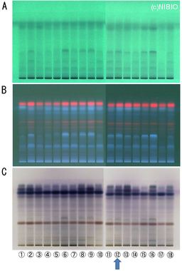 | Memo | A. 254nm B. 366nm C. 4-メトキシベンズアルデヒド・硫酸試液噴霧後、加熱 ①NIB-1097 ②NIB-1098 ③NIB-1099 ④NIB-1100 ⑤NIB-1101 ⑥NIB-1102 ⑦NIB-1103 ⑧NIB-1104 ⑨NIB-1105 ⑩NIB-1106 ⑪NIB-1107 ⑫NIB-1108 ⑬NIB-1109 ⑭NIB-1110 ⑮NIB-1111 ⑯NIB-1112 ⑰NIB-1113 ⑱NIB-1117 |