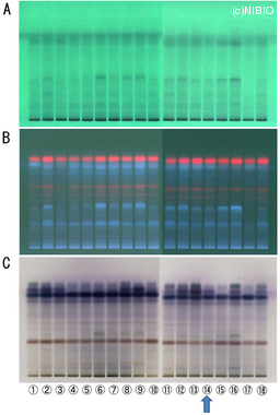 | Memo | A. 254nm B. 366nm C. 4-メトキシベンズアルデヒド・硫酸試液噴霧後、加熱 ①NIB-1097 ②NIB-1098 ③NIB-1099 ④NIB-1100 ⑤NIB-1101 ⑥NIB-1102 ⑦NIB-1103 ⑧NIB-1104 ⑨NIB-1105 ⑩NIB-1106 ⑪NIB-1107 ⑫NIB-1108 ⑬NIB-1109 ⑭NIB-1110 ⑮NIB-1111 ⑯NIB-1112 ⑰NIB-1113 ⑱NIB-1117 |