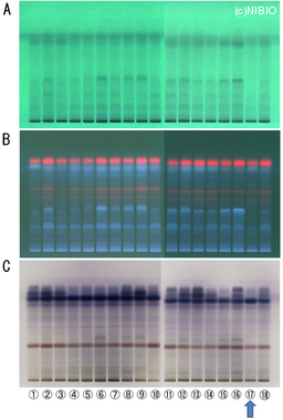 | Memo | A. 254nm B. 366nm C. 4-メトキシベンズアルデヒド・硫酸試液噴霧後、加熱 ①NIB-1097 ②NIB-1098 ③NIB-1099 ④NIB-1100 ⑤NIB-1101 ⑥NIB-1102 ⑦NIB-1103 ⑧NIB-1104 ⑨NIB-1105 ⑩NIB-1106 ⑪NIB-1107 ⑫NIB-1108 ⑬NIB-1109 ⑭NIB-1110 ⑮NIB-1111 ⑯NIB-1112 ⑰NIB-1113 ⑱NIB-1117 |