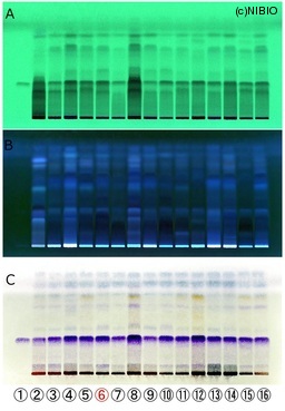 | Memo | A. 254nm B. 366nm C. 4-メトキシベンズアルデヒド・硫酸試液(加熱) spray evenly 4-methoxybenzaldehyde-sulfuric acid ①STD.Paeoniflorin ②NIB-023 ③NIB-024 ④NIB-046 ⑤NIB-063 ⑥NIB-072 ⑦NIB-082 ⑧NIB-083⑨NIB-098 ⑩NIB-128 ⑪NIB-129 ⑫NIB-130 ⑬NIB-157 ⑭NIB-172 ⑮NIB-197 ⑯NIB-225 |