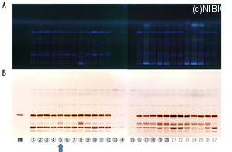 | Memo | A. 366nm B. 白色光 標:アミグダリン ① NIB-0272 ② NIB-0425 ③ NIB-0426 ④ NIB-0452 ⑤ NIB-0502 ⑥ NIB-0503 ⑦ NIB-0504 ⑧ NIB-0505 ⑨ NIB-0506 ⑩ NIB-0507 ⑪ NIB-0508 ⑫ NIB-0509 ⑬ NIB-0510 ⑭ NIB-0511 ⑮ NIB-0512 ⑯ NIB-0513 ⑰ NIB-0514 ⑱ NIB-0515 ⑲ NIB-0516 ⑳ NIB-0517 21 NIB-0518 22 NIB-0519 23 NIB-0520 24 NIB-0521 25 NIB-0522 26 NIB-0633 27 NIB-0744 |