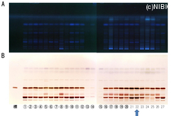 | Memo | A. 366nm B. 白色光 標:アミグダリン ① NIB-0272 ② NIB-0425 ③ NIB-0426 ④ NIB-0452 ⑤ NIB-0502 ⑥ NIB-0503 ⑦ NIB-0504 ⑧ NIB-0505 ⑨ NIB-0506 ⑩ NIB-0507 ⑪ NIB-0508 ⑫ NIB-0509 ⑬ NIB-0510 ⑭ NIB-0511 ⑮ NIB-0512 ⑯ NIB-0513 ⑰ NIB-0514 ⑱ NIB-0515 ⑲ NIB-0516 ⑳ NIB-0517 21 NIB-0518 22 NIB-0519 23 NIB-0520 24 NIB-0521 25 NIB-0522 26 NIB-0633 27 NIB-0744 |