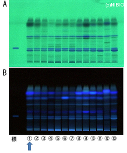 | Memo | A. 254nm B. 366nm 標:4'-O-Glucosyl-5-O-methylvisamminol ① NIB-0244 ② NIB-0245 ③ NIB-0266 ④ NIB-0321 ⑤ NIB-0322 ⑥ NIB-0323 ⑦ NIB-0324 ⑧ NIB-0325 ⑨ NIB-0326 ⑩ NIB-0328 ⑪ NIB-0432 ⑫ NIB-0442 ⑬ NIB-0734 |