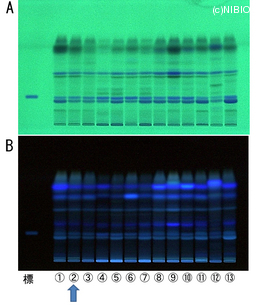 | Memo | A. 254nm B. 366nm 標:4'-O-Glucosyl-5-O-methylvisamminol ① NIB-0244 ② NIB-0245 ③ NIB-0266 ④ NIB-0321 ⑤ NIB-0322 ⑥ NIB-0323 ⑦ NIB-0324 ⑧ NIB-0325 ⑨ NIB-0326 ⑩ NIB-0328 ⑪ NIB-0432 ⑫ NIB-0442 ⑬ NIB-0734 |