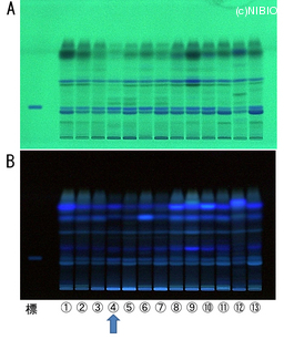| Memo | A. 254nm B. 366nm 標:4'-O-Glucosyl-5-O-methylvisamminol ① NIB-0244 ② NIB-0245 ③ NIB-0266 ④ NIB-0321 ⑤ NIB-0322 ⑥ NIB-0323 ⑦ NIB-0324 ⑧ NIB-0325 ⑨ NIB-0326 ⑩ NIB-0328 ⑪ NIB-0432 ⑫ NIB-0442 ⑬ NIB-0734 |