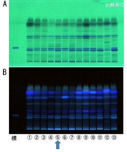| Memo | A. 254nm B. 366nm 標:4'-O-Glucosyl-5-O-methylvisamminol ① NIB-0244 ② NIB-0245 ③ NIB-0266 ④ NIB-0321 ⑤ NIB-0322 ⑥ NIB-0323 ⑦ NIB-0324 ⑧ NIB-0325 ⑨ NIB-0326 ⑩ NIB-0328 ⑪ NIB-0432 ⑫ NIB-0442 ⑬ NIB-0734 |