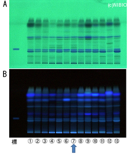 | Memo | A. 254nm B. 366nm 標:4'-O-Glucosyl-5-O-methylvisamminol ① NIB-0244 ② NIB-0245 ③ NIB-0266 ④ NIB-0321 ⑤ NIB-0322 ⑥ NIB-0323 ⑦ NIB-0324 ⑧ NIB-0325 ⑨ NIB-0326 ⑩ NIB-0328 ⑪ NIB-0432 ⑫ NIB-0442 ⑬ NIB-0734 |