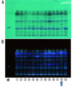 | Memo | A. 254nm B. 366nm 標:4'-O-Glucosyl-5-O-methylvisamminol ① NIB-0244 ② NIB-0245 ③ NIB-0266 ④ NIB-0321 ⑤ NIB-0322 ⑥ NIB-0323 ⑦ NIB-0324 ⑧ NIB-0325 ⑨ NIB-0326 ⑩ NIB-0328 ⑪ NIB-0432 ⑫ NIB-0442 ⑬ NIB-0734 |