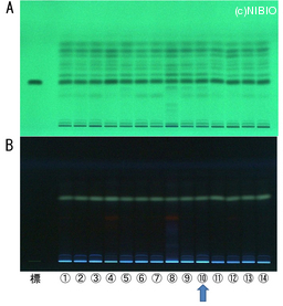 | Memo | A. 254nm B. 366nm 標:シザンドリン ① NIB-0246 ② NIB-0270 ③ NIB-0353 ④ NIB-0354 ⑤ NIB-0355 ⑥ NIB-0356 ⑦ NIB-0357 ⑧ NIB-0358 ⑨ NIB-0359 ⑩ NIB-0360 ⑪ NIB-0437 ⑫ NIB-0446 ⑬ NIB-0646 ⑭ NIB-0737 |