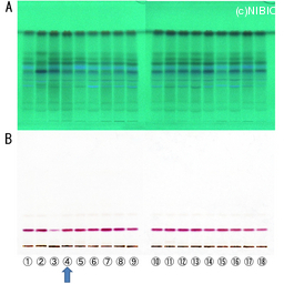 | Condition | (試料調製)各試料の粉末0.2 gにメタノール1.0 mLを加え、約5分間超音波処理を行った。遠心分離後、得られた上清を試料溶液とした。 (TLC条件)注入量:試料溶液2または5 μL、標準溶液2 μL(1 mg/mL)、展開溶媒:酢酸エチル/1-プロパノール/水/酢酸(7:5:4:1)、n-ヘキサン/アセトン(3:1)、検出:UV照射(254 nm)、希硫酸試液噴霧後、加熱。 |