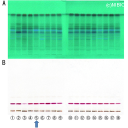 | Condition | (試料調製)各試料の粉末0.2 gにメタノール1.0 mLを加え、約5分間超音波処理を行った。遠心分離後、得られた上清を試料溶液とした。 (TLC条件)注入量:試料溶液2または5 μL、標準溶液2 μL(1 mg/mL)、展開溶媒:酢酸エチル/1-プロパノール/水/酢酸(7:5:4:1)、n-ヘキサン/アセトン(3:1)、検出:UV照射(254 nm)、希硫酸試液噴霧後、加熱。 |