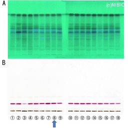 | Condition | (試料調製)各試料の粉末0.2 gにメタノール1.0 mLを加え、約5分間超音波処理を行った。遠心分離後、得られた上清を試料溶液とした。 (TLC条件)注入量:試料溶液2または5 μL、標準溶液2 μL(1 mg/mL)、展開溶媒:酢酸エチル/1-プロパノール/水/酢酸(7:5:4:1)、n-ヘキサン/アセトン(3:1)、検出:UV照射(254 nm)、希硫酸試液噴霧後、加熱。 |
