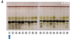 | Condition | (試料調製)各試料の粉末0.1 gにメタノール1.0 mLを加え、約5分間超音波処理を行った。遠心分離後、得られた上清を試料溶液とした。 (TLC条件)注入量:試料溶液5 μL、標準溶液1 μL(1 mg/mL)、展開溶媒:酢酸エチル/1-プロパノール/水/酢酸(7:5:4:1)、検出:希硫酸試液噴霧後、加熱。 |
