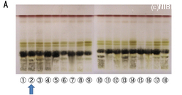 | Condition | (試料調製)各試料の粉末0.1 gにメタノール1.0 mLを加え、約5分間超音波処理を行った。遠心分離後、得られた上清を試料溶液とした。 (TLC条件)注入量:試料溶液5 μL、標準溶液1 μL(1 mg/mL)、展開溶媒:酢酸エチル/1-プロパノール/水/酢酸(7:5:4:1)、検出:希硫酸試液噴霧後、加熱。 |