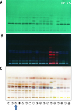 | Condition | (試料調製)各試料の粉末0.1 gにメタノール1.0 mLを加え、約5分間超音波処理を行った。遠心分離後、得られた上清を試料溶液とした。 (TLC条件)注入量:各5 μL、展開溶媒:n-ヘキサン/酢酸エチル(2:1)、検出:UV照射(254 nm、366 nm)、希硫酸試液噴霧後、加熱。 |