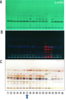 | Condition | (試料調製)各試料の粉末0.1 gにメタノール1.0 mLを加え、約5分間超音波処理を行った。遠心分離後、得られた上清を試料溶液とした。 (TLC条件)注入量:各5 μL、展開溶媒:n-ヘキサン/酢酸エチル(2:1)、検出:UV照射(254 nm、366 nm)、希硫酸試液噴霧後、加熱。 |