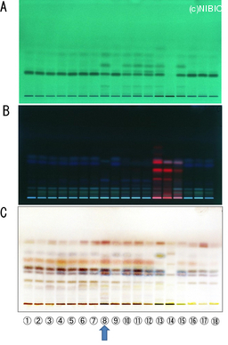 | Condition | (試料調製)各試料の粉末0.1 gにメタノール1.0 mLを加え、約5分間超音波処理を行った。遠心分離後、得られた上清を試料溶液とした。 (TLC条件)注入量:各5 μL、展開溶媒:n-ヘキサン/酢酸エチル(2:1)、検出:UV照射(254 nm、366 nm)、希硫酸試液噴霧後、加熱。 |