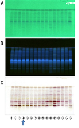 | Memo | A. 254nm B. 366nm C. 白色光 ① NIB-0252 ② NIB-0419 ③ NIB-0461 ④ NIB-0640 ⑤ NIB-0718 ⑥ NIB-0719 ⑦ NIB-0720 ⑧ NIB-0721 ⑨ NIB-0722 ⑩ NIB-0723 ⑪ NIB-0724 ⑫ NIB-0725 ⑬ NIB-0726 ⑭ NIB-0727 ⑮ NIB-0728 ⑯ NIB-0754 |