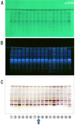 | Memo | A. 254nm B. 366nm C. 白色光 ① NIB-0252 ② NIB-0419 ③ NIB-0461 ④ NIB-0640 ⑤ NIB-0718 ⑥ NIB-0719 ⑦ NIB-0720 ⑧ NIB-0721 ⑨ NIB-0722 ⑩ NIB-0723 ⑪ NIB-0724 ⑫ NIB-0725 ⑬ NIB-0726 ⑭ NIB-0727 ⑮ NIB-0728 ⑯ NIB-0754 |