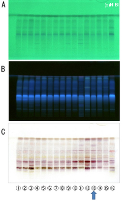 | Memo | A. 254nm B. 366nm C. 白色光 ① NIB-0252 ② NIB-0419 ③ NIB-0461 ④ NIB-0640 ⑤ NIB-0718 ⑥ NIB-0719 ⑦ NIB-0720 ⑧ NIB-0721 ⑨ NIB-0722 ⑩ NIB-0723 ⑪ NIB-0724 ⑫ NIB-0725 ⑬ NIB-0726 ⑭ NIB-0727 ⑮ NIB-0728 ⑯ NIB-0754 |